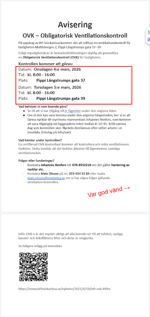 Information om kommande OVK (Obligatorisk Ventilationskontroll)
